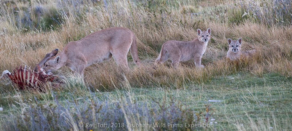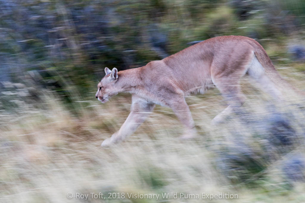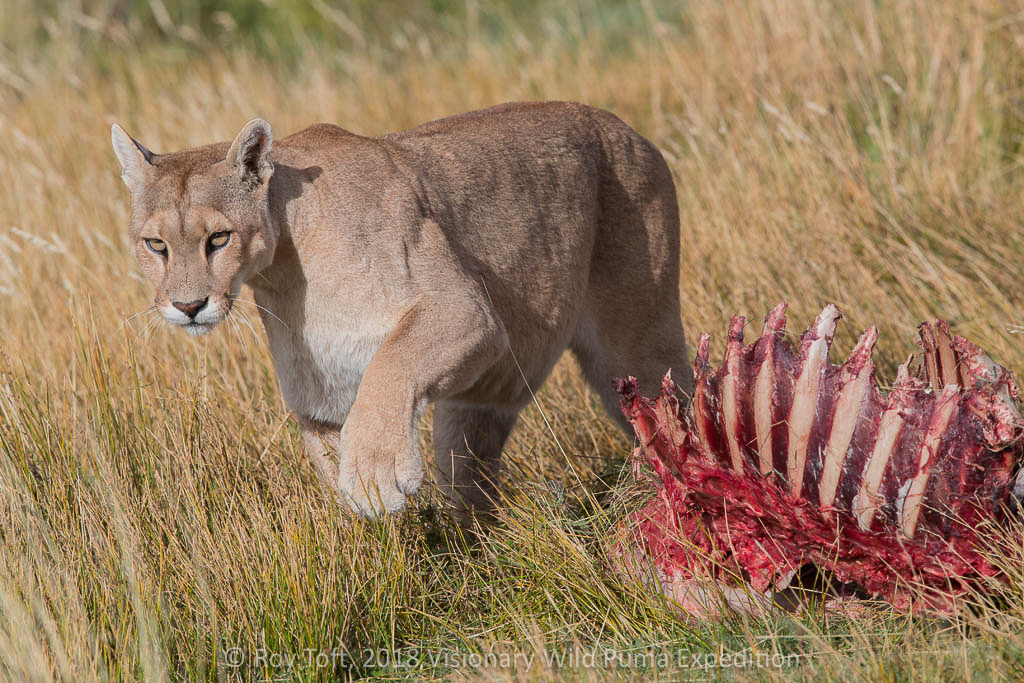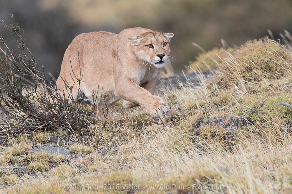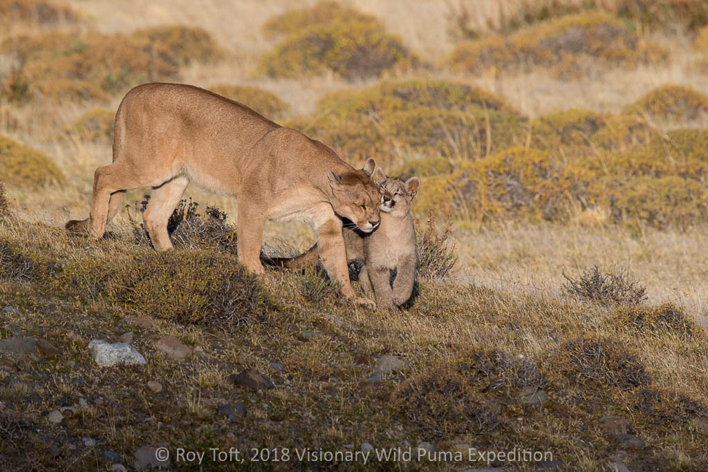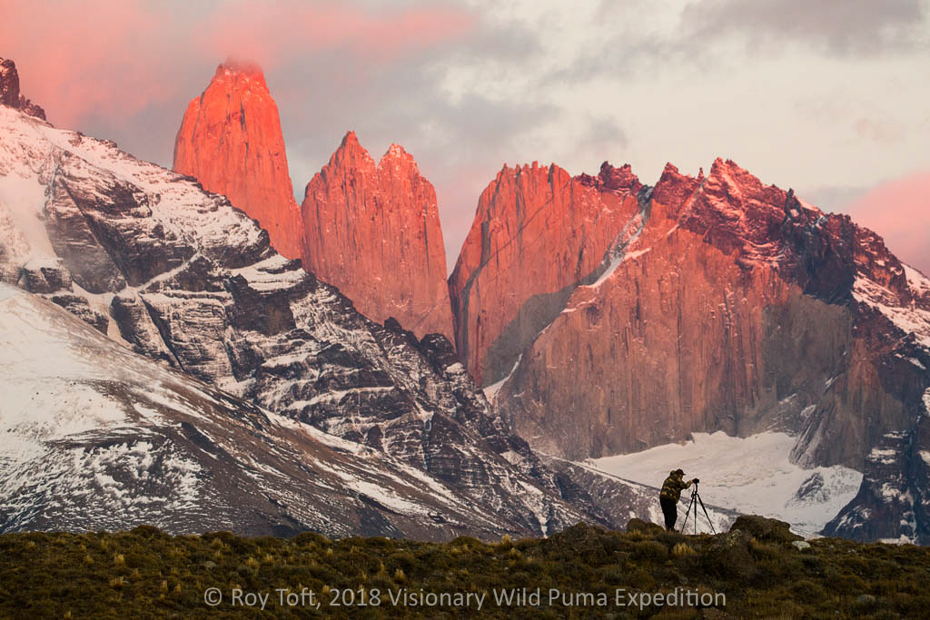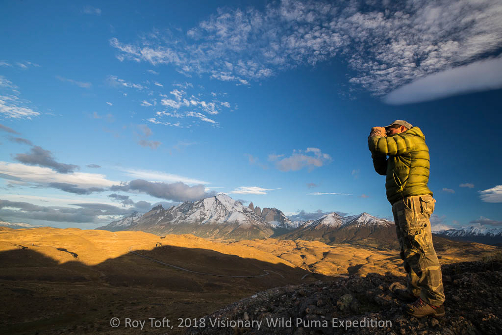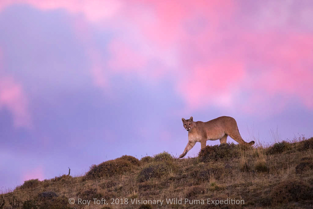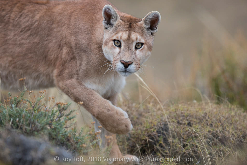 To find out for yourself, make pictures you never imagined were possible, and learn a great deal about puma behavior in the process, join Roy Toft on a huge private ranch, Estancia Laguna Amarga, with panoramic views over one of the most beautiful landscapes on Earth: Chile’s Torres del Paine National Park. A healthy population of wild pumas roam free there, moving at will between the ranch and park, and we have mastered the art of successfully tracking these apex predators through this landscape of rolling hills beneath the Paine range.